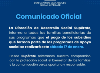 La Dirección de Desarrollo Social Supérate informó que este sábado 17 de enero se realizará el pago de los subsidios correspondientes a los programas de apoyo…