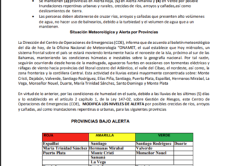 El Centro de Operaciones de Emergencias (COE) informó que mantiene este miércoles a tres provincias en alerta roja, cinco en amarilla y cuatro en…
