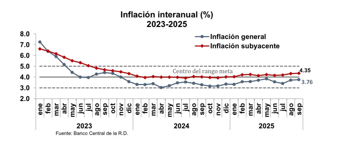 El Banco Central de la República Dominicana (BCRD) informó que el índice de precios al consumidor (IPC) registró una variación mensual de 0.34 % hasta septiembre de 2025, mientras que la inflación interanual, medida desde el mismo mes de 2024, se ubicó en 3.76 %.