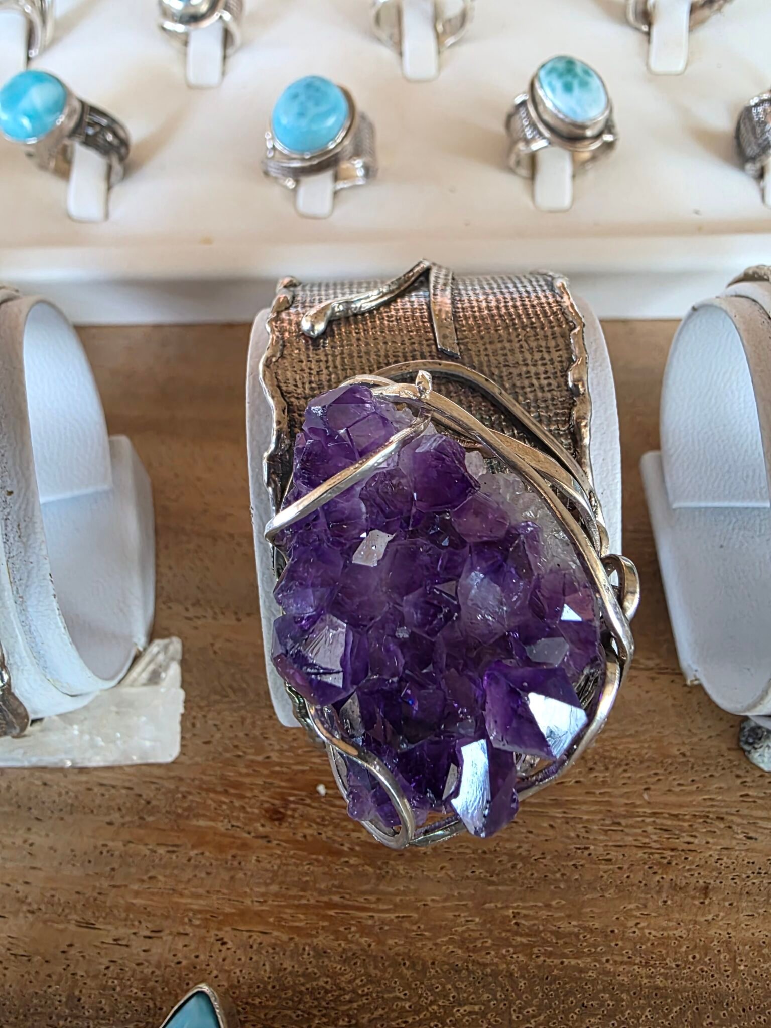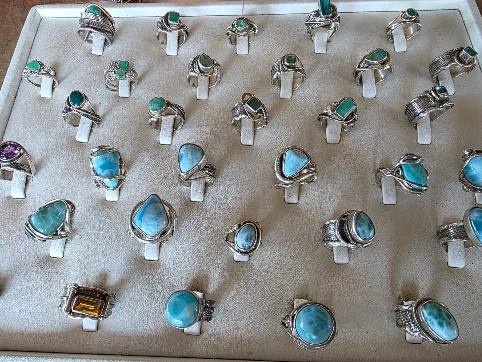 Leo SILVERSMITH ofrece además una amplia selección de piedras preciosas y semipreciosas provenientes de distintas partes del mundo, incluyendo larimar dominicano, ámbar, piedra lunar, amatista, ópalos de diversas variedades, citrino, topacio azul, obsidiana, peridoto, aguamarina, así como piezas excepcionales con zafiros estrella y rubíes estrella, considerados entre las gemas más raras y valiosas.