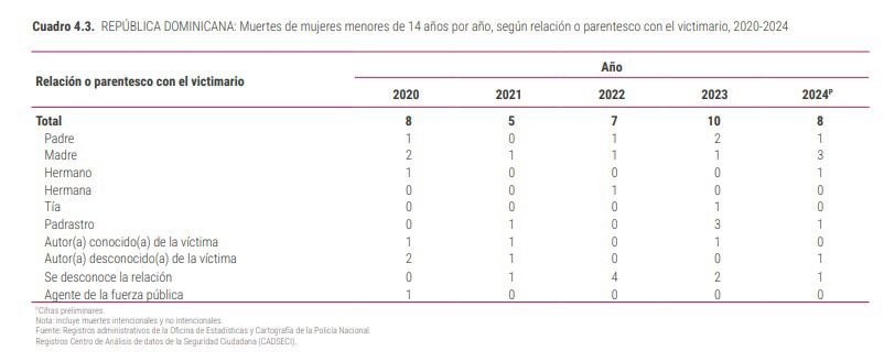 Sin embargo, según la Oficina Nacional de Estadísticas (ONE), entre 2020-2024, de las 708 muertes en condiciones de violencia registrados, unas 50 fueron menores de 14 años y entre estas, cinco perdieron la vida a manos de parejas sentimentales o exparejas.